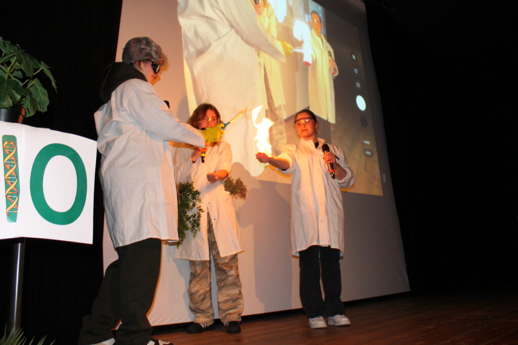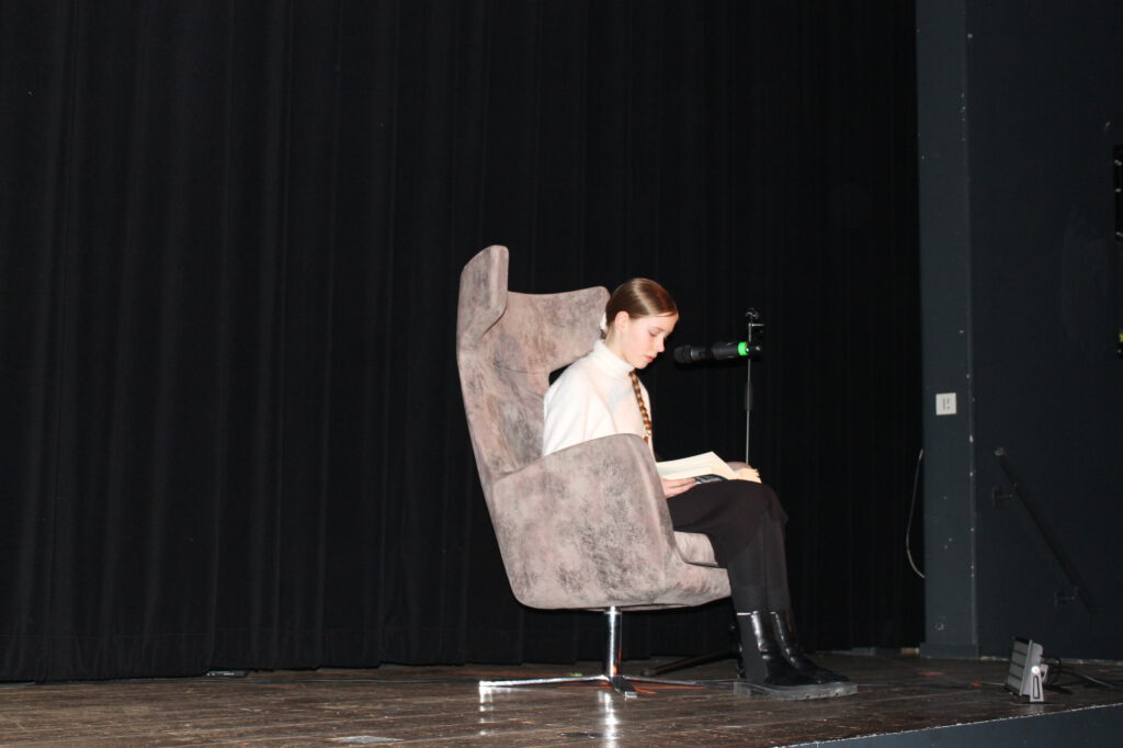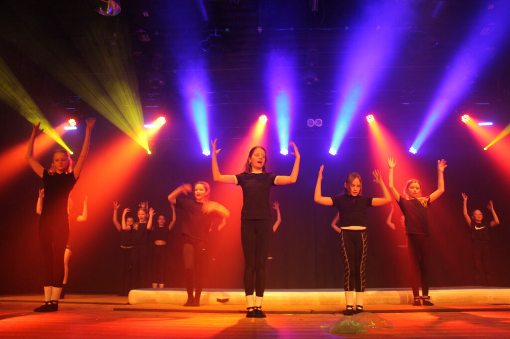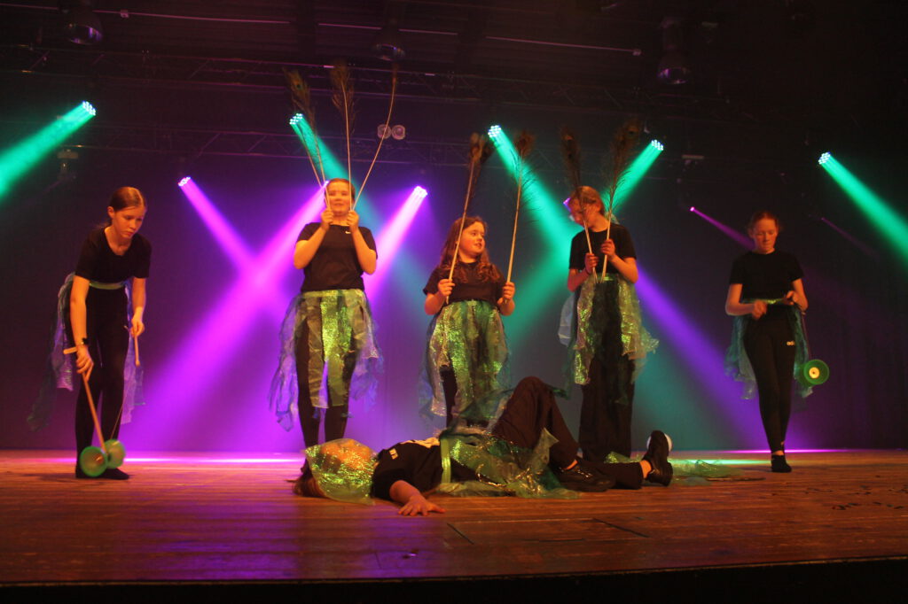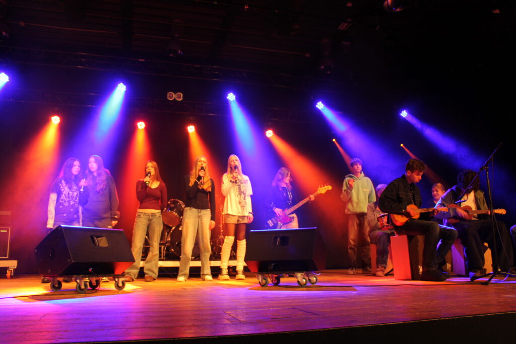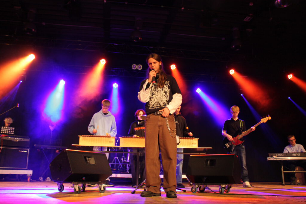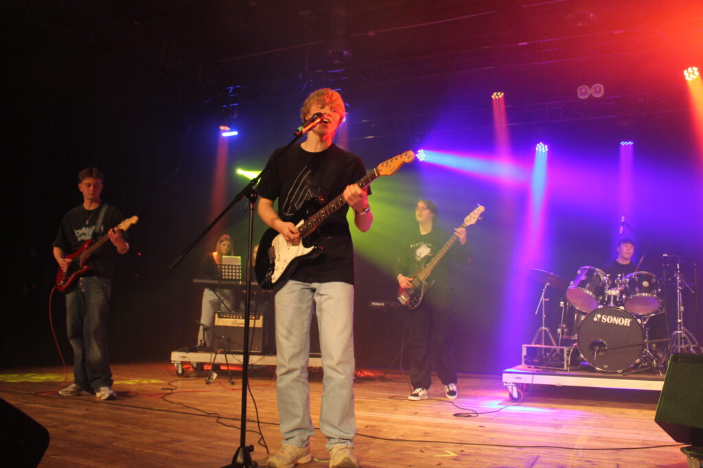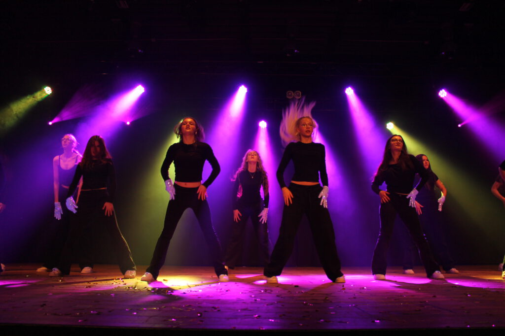 Nach der Unterbrechung leitete der ERG-Kurs Musik des 9. Jahrgangs den zweiten Teil des Abends ein. Mit ,,Feels Like I’m Falling in Love“ von Coldplay, ,,Heroes“ von David Bowie sowie dem selbst geschriebenen Song ,,Dead Man Walking“ von Justin Diekmann (9f) spannten die Schülerinnen und Schüler einen eindrucksvollen musikalischen Bogen zwischen bekannten Klassikern und eigener Kreativität. Im Anschluss folgte ein humorvoller Blick in die Antike: Der Philosophie Grundkurs der Q1 beleuchtete in einem amüsanten Videobeitrag das Leben des Sokrates und zeigte, dass große Gedanken auch mit einem Augenzwinkern vermittelt werden können. Daraufhin beeindruckten Daliyah Günay und Clara Semelka aus der 8e mit einer eigenständig erarbeiteten Tanzdarbietung: Kraftvolle Moves, eine ausdrucksstarke Körpersprache und ein mitreißender Rhythmus fesselten die Zuschauerinnen und Zuschauer und gaben dem Auftritt einen energiegeladenen Akzent. Den letzten musikalischen Höhepunkt lieferten die Schülerinnen und Schüler des Musikkurses der Q2: „A Sky Full of Stars“ von Coldplay füllte den Saal mit funkelnden Klängen, bevor der Song ,,What I’ve Done“ von Linkin Park kraftvoll rockige Töne entfaltete und für einen dynamischen Kontrast sorgte. Den krönenden Abschluss bildeten schließlich die Zirkusartistinnen der Jahrgänge 5 bis 7. Mit verträumten Tanzeinlagen, waghalsigen Sprüngen und tollkühnen Turnelementen sorgten sie für Staunen im Saal und verabschiedeten die Gäste mit einem spektakulären Finale.