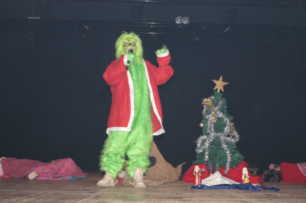 Bereits die Eröffnung ließ keinen Zweifel daran, dass das Publikum einen besonderen Abend erwarten würde: Der ERG-Kurs Musik des 10. Jahrgangs stimmte mit dem Song ,,Riptide“ auf die Veranstaltung ein. Gesang und Instrumente griffen dabei harmonisch ineinander und bildeten den klangvollen Auftakt für ein Programm, das sich fortan in stetigem Wechsel entfaltete. Nahtlos übernahm die Theater-AG der Jahrgänge 5 bis 7 die Bühne und entführte die Zuschauerinnen und Zuschauer mit dem Stück ,,Der Grinch und die Hüs“ noch einmal in den Zauber der Weihnachtszeit. Hoch oben im Wiehengebirge, dort, wo der Wind pfeift und kaum jemand wohnt, lebt der Grinch – ein Wesen, das Weihnachten in all seinen Facetten verabscheut. Mit viel Spielfreude, Witz und liebevollen Details ließen die jungen Schauspielerinnen und Schauspieler die bekannte Geschichte lebendig werden und ernteten dafür herzlichen Applaus. Musikalisch-rhythmisch ging es weiter, als vier Schülerinnen und Schüler aus der Klasse 6e mit dem Percussion-Stück ,,Hey DJ“ bewiesen, dass Musik auch ganz ohne Melodieinstrumente funktioniert. Allein durch präzise Rhythmen entstand ein mitreißender Klangteppich, der das Publikum sichtbar fesselte. Einen ganz anderen, aber nicht minder unterhaltsamen Akzent setzten drei Schülerinnen aus dem WP-Kurs Naturwissenschaften des 10. Jahrgangs. Als Vertreterinnen der Wissenschaften Physik, Chemie und Biologie lieferten sie sich auf der Bühne einen augenzwinkernden Wettstreit der Disziplinen, experimentierten, argumentierten und rivalisierten – nur um am Ende zu einem klaren Fazit zu gelangen: ,,Zusammen sind wir besser!“ Auf diesen experimentellen Wettstreit folgte die digitale Weihnachtswerkstatt der Klasse 6a: In einem Videobeitrag präsentierten die Schülerinnen und Schüler ihren selbstgebauten Mini-Computer Calliope, mit dem sie blinkende Weihnachtssterne, Musik und digitale Schneekugeln erzeugten – ganz nach dem Motto: ‚,Mission Weihnachtsrettung gesichert!“ An Bord der digitalen Welt gingen auch die Schülerinnen und Schüler der Klasse 5c mit ihrem Mini-Musical ,,Web-Piraten“. Mit selbst gestalteten Plakaten, viel Bühnenenergie und ausdrucksstarken Gesangseinlagen entführten sie das Publikum auf eine musikalische Reise durch die Welt der Computer und des Internets. Einen Moment konzentrierter Stille bescherte Sophie Löwen aus der Klasse 6e. Als Gewinnerin des Vorlesewettbewerbs ließ sie die Gäste in die Handlung des Jugendbuchs ,,Tommy Joe – und die Tochter des Trappers“ von Heidi Ulrich eintauchen und überzeugte durch eine stimmungsvolle Gestaltung ihres Vortrags. Nach den kreativen Beiträgen der Schülerinnen und Schüler bewies auch das Kollegium, dass Schulkultur an der Gesamtschule Hüllhorst gelebt wird: Mit dem Song ,,This Is Me“ aus dem Film ,,The Greatest Showman“ überraschten die Lehrkräfte die Gäste und setzten ihrem Auftritt mit einem goldenen Konfettiregen einen glanzvollen Höhepunkt. Anschließend zog der ERG-Kurs Showdance des 10. Jahrgangs mit kraftvoller Dynamik und synchronen Bewegungen zu einem Michael-Jackson-Medley das Publikum in seinen Bann und begeisterte mit Ausdrucksstärke und spürbarer Leidenschaft.