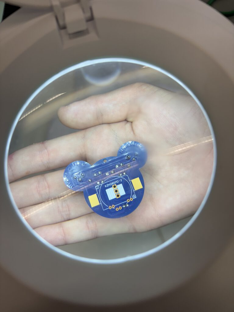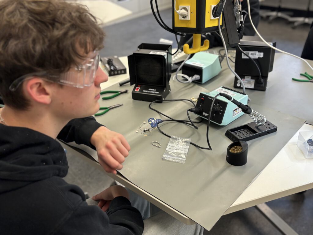 Die Schülerinnen und Schüler lernten dort das Löten von Platinen und bestückten eine kleine, Micky-Maus-ähnliche Leiterplatine mit LEDs, Transistoren, Widerständen, Kondensatoren, Schaltern und einer Batterie. Der entstandene „Blinky“ durfte am Ende stolz mit nach Hause genommen werden.