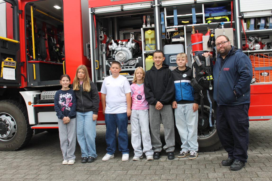 Mit dabei waren der Beauftragte für Brandschutzerziehung Jens Scheiding, Kinderfeuerwehrwartin Sonja Mehnert, der stellvertretende Kinderfeuerwehrwart Rene Bussmann sowie Feuerwehrmann Tobias Hagemann. Sie stellten nicht nur die vielfältigen Aufgaben der Feuerwehr vor, sondern beantworteten auch zahlreiche Fragen der Schülerinnen und Schüler rund um Brandschutz und Sicherheit.